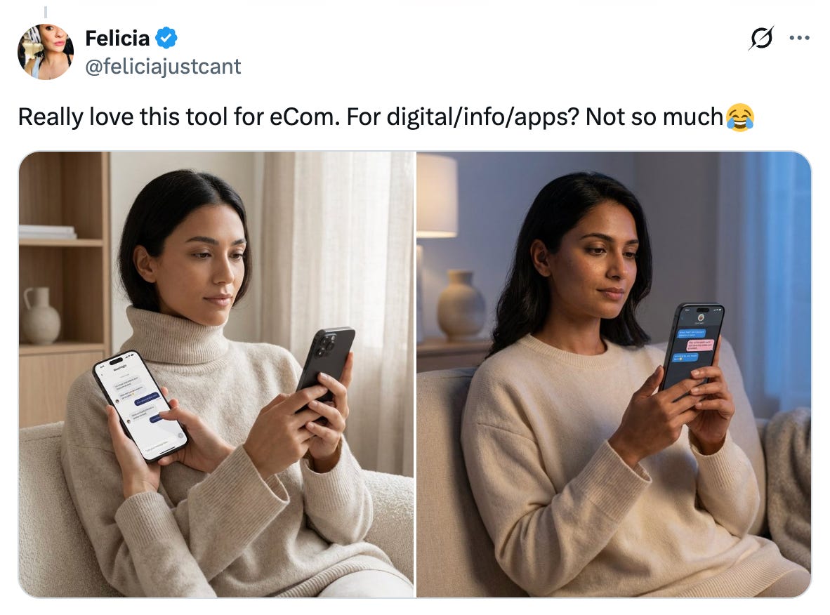 Speaking of physics, we definitely saw a few of these come up after launch. Like this one user who got an image of a person who had a few too many hands, or someone who was shown holding a phone…backwards. These are a perfect example of image generations that fell within a “loss bucket”, and the team is now actively rolling out more improvements post-launch. Quality is a hill you continue to climb after day one.