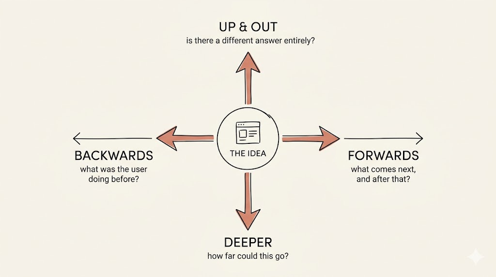 The first is that it forces me to check whether an idea is big enough. One failure mode I see a lot right now - in my own thinking and in the PMs I talk to - isn’t picking the wrong idea. It’s picking an idea that’s too small. We’ve gotten so good at shipping that we forget to ask whether the thing we’re shipping is worth the effort it takes to ship it. Walking the four directions almost always reveals that the original framing was narrower than it needed to be.