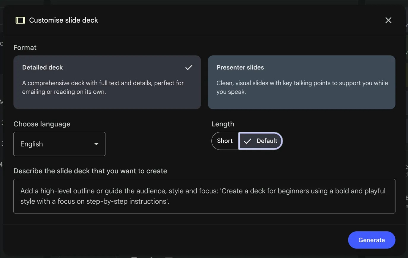 This is the direction I think gets underused the most. Take the feature you’ve shipped and ask: am I really doing as much as I could here? Take NotebookLM’s slide generation as an example. They cracked the ability to turn a pile of source material into a real, coherent presentation - which is genuinely magical. Today you can already pick between a detailed deck and cleaner presenter slides, choose a language, set the length, and steer the style with a short prompt. That’s already a lot. But you can keep walking the vector. Could you edit an individual slide without regenerating the whole deck? Could you hand it a brand kit and have the styling actually stick? Could you riff with it on the structure before it commits to an outline? The feature isn’t a single point. It’s a direction, and you can keep going.