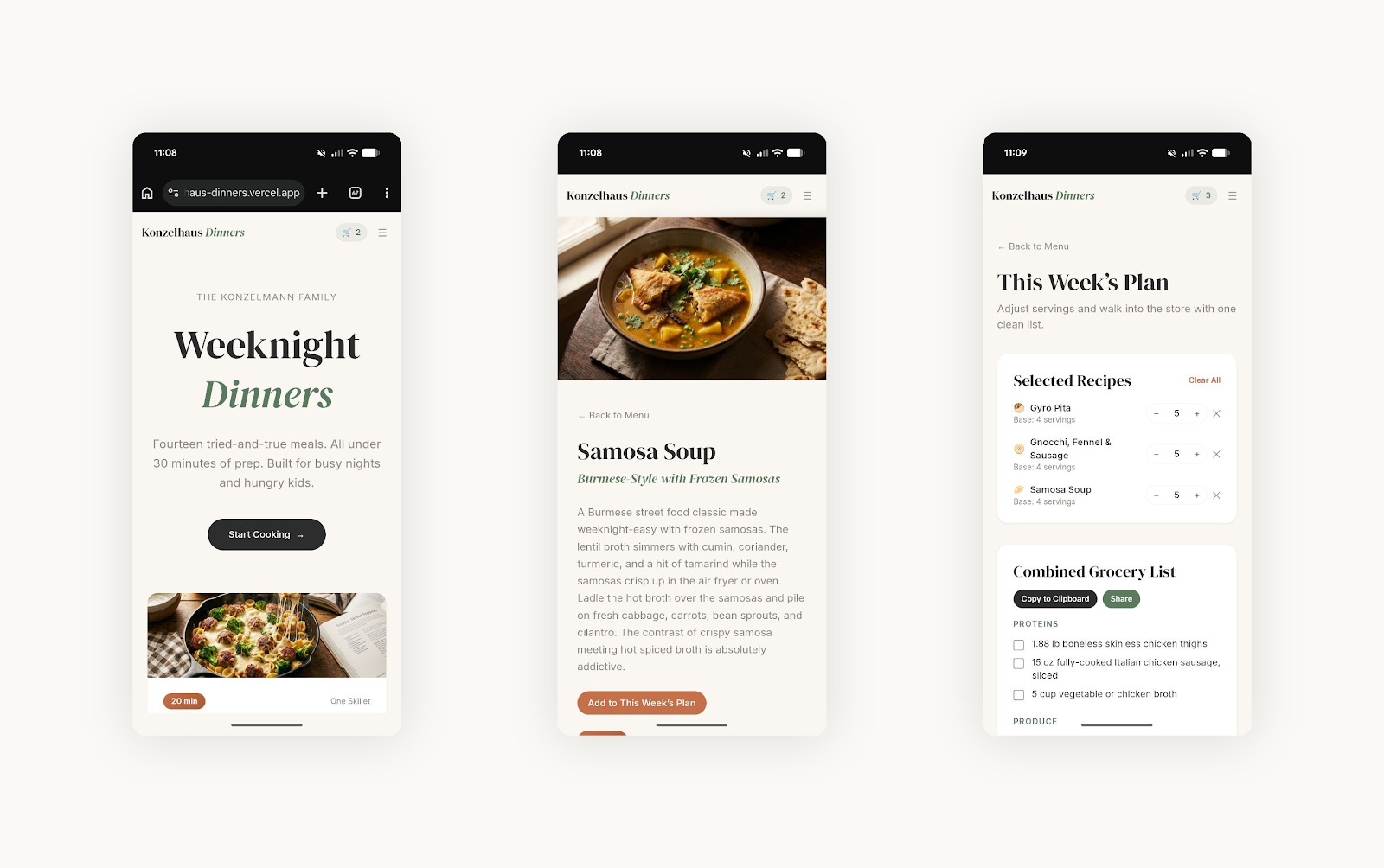 I asked Lulubot to help me land on 10 “go-to” recipes - sheet pan gnocchi, chicken tacos - that take less than 30 minutes. But I quickly realized that a chat log is a terrible place to store a meal plan. I wanted to see the food.