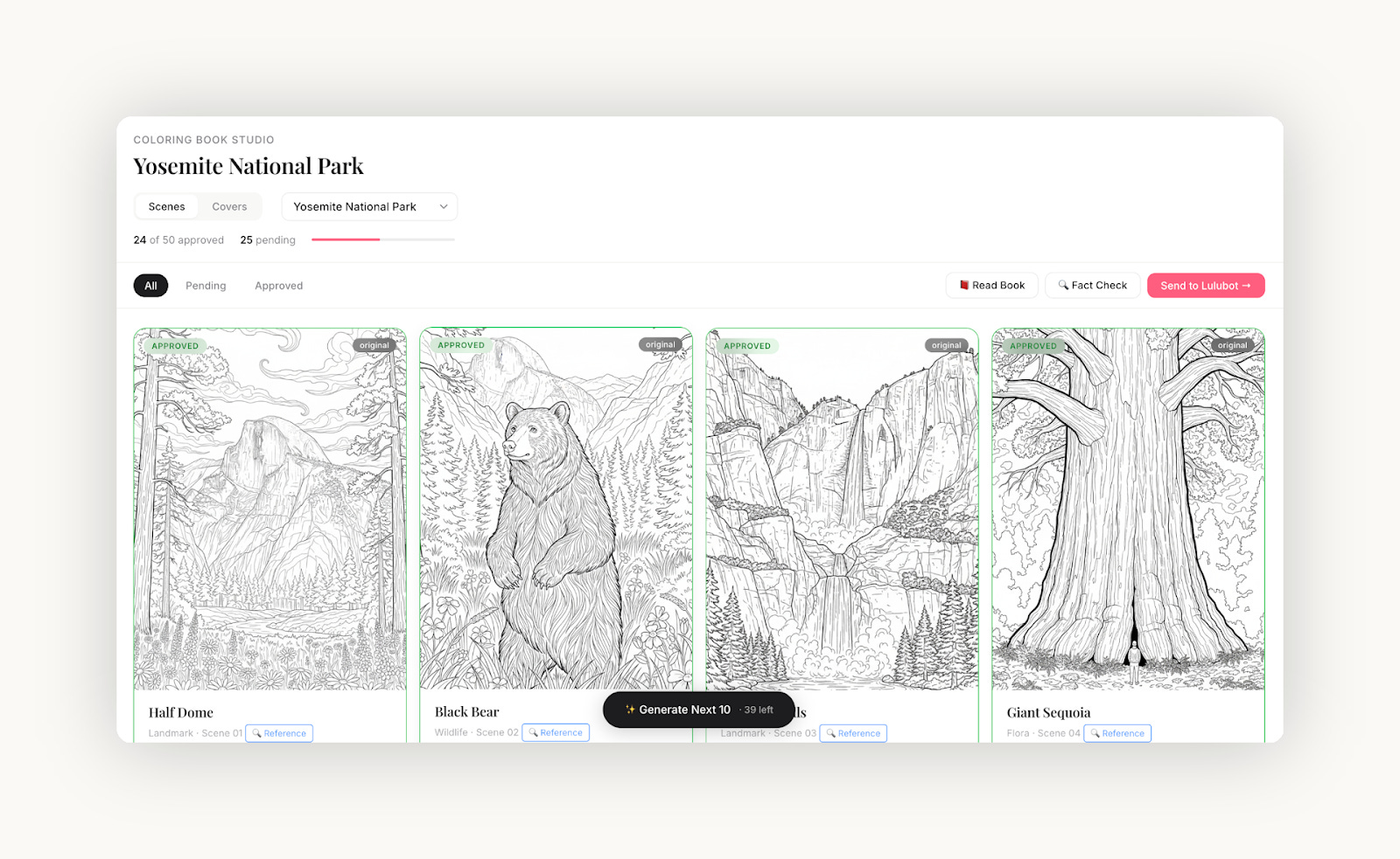 In the Web App: I could visually edit and approve the coloring book pages, organize the layout, and keep track of the overall book’s completion as it got built.