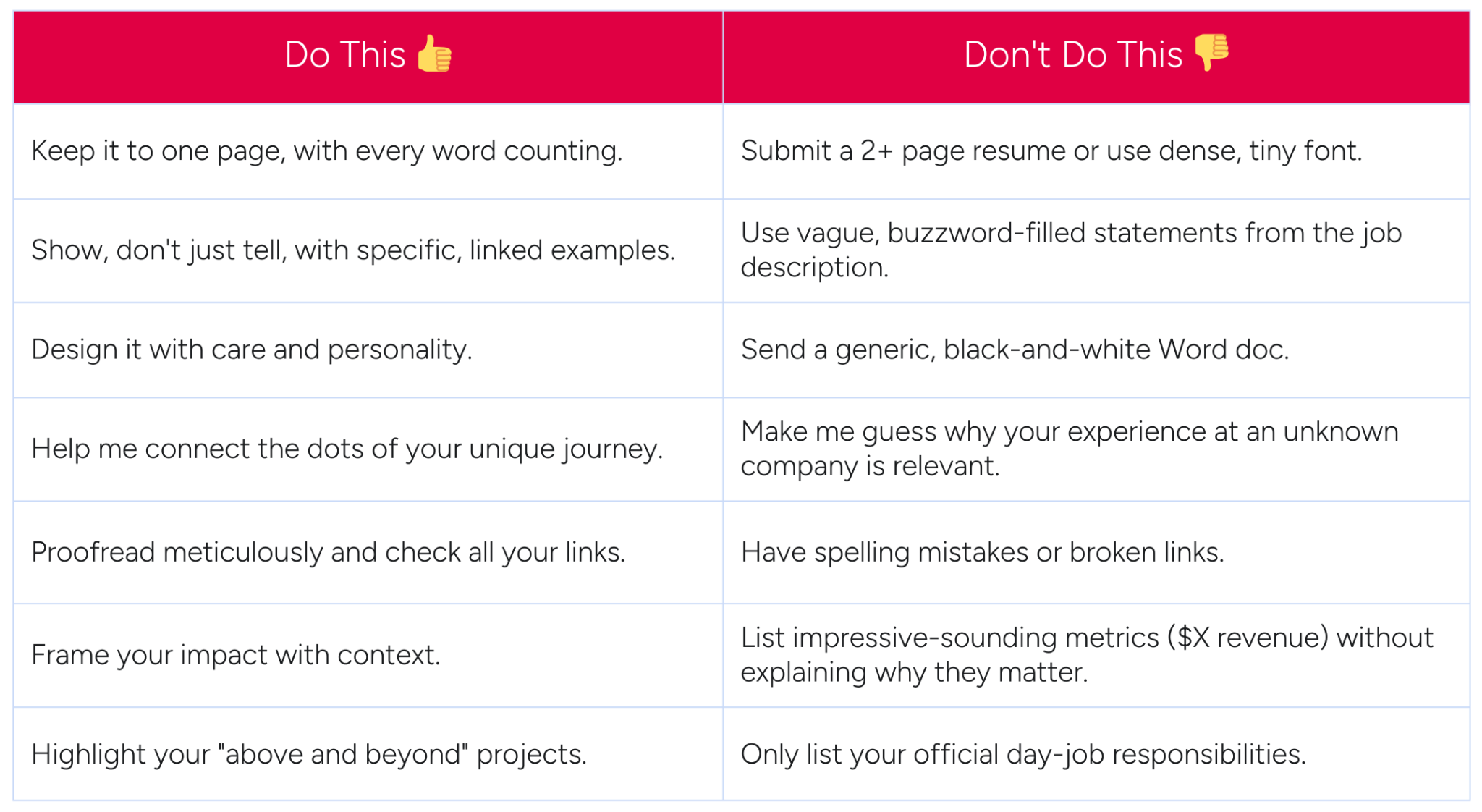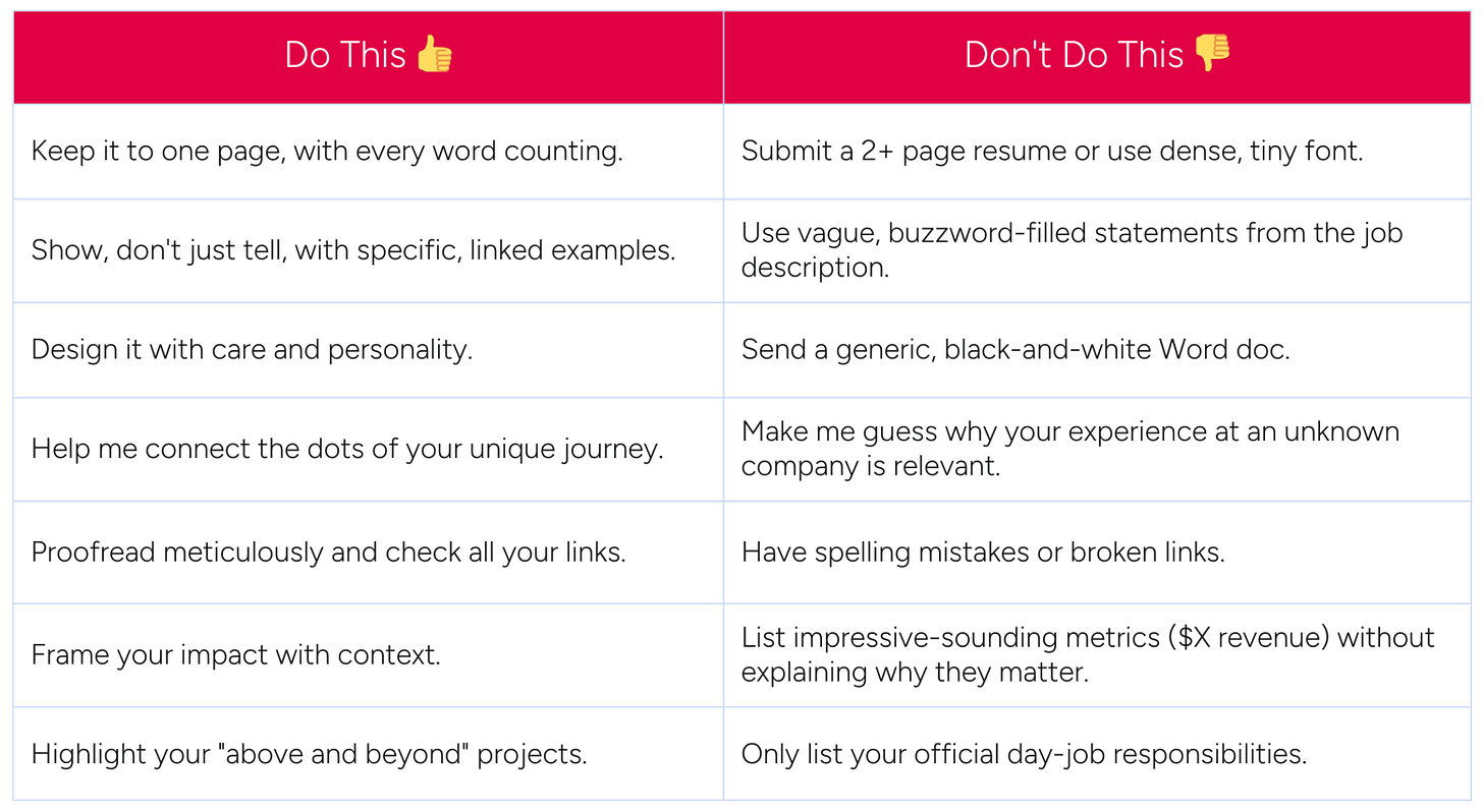 With each round, the candidate pool narrows until the right PM is found. This post is all about clearing that first hurdle - the resume scan. After reviewing over 100 applications, here are the dos and don’ts that I’ve found truly separate the signal from the noise.